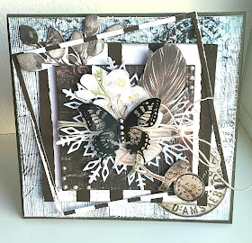 som der er så mange elementer på papirerne som man kan klippe ud og pynte med. Die jeg har brugt til basen er fra Marianne design og stempler fra Threescoops.