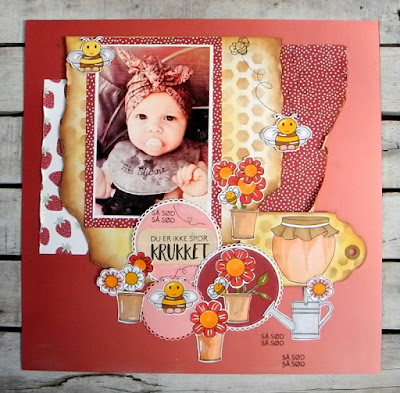 Jeg har ikke lavet et layout i flere år tror jeg men nu synes jeg det var tid til igen at prøve nu vi har vores dejlige oldebarn som model, jeg har igen brugt papir og stempler fra Threescoops og det var rigtig hyggeligt og et lidt anderledes stil end jeg plejer, her er kun brugt masser af farvelagte stempler som pynt.